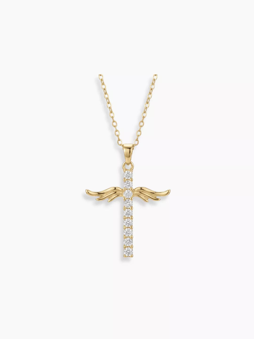 ”Engelsmut“ - Enkelinsiipiristi-kaulakoru zirkonioilla, 14 karaatin kultaa