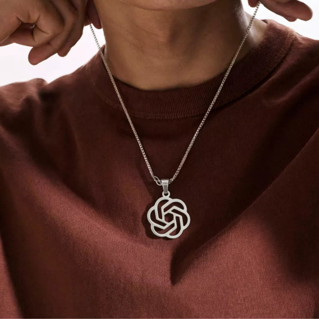 Der geometrische Anhänger, inspiriert vom OpenAI-Logo, symbolisiert die Verbindung zwischen Herz und Verstand – ein Zeichen für Gleichgewicht, Fortschritt und die Zukunft der Technologie.